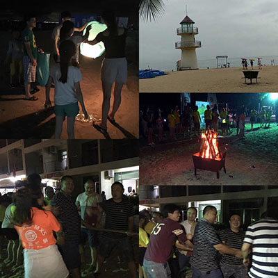 雨后的沙灘空氣格外清新,吃飽喝足,柔軟的沙灘讓腳板真正的解放了,大家在沙灘上圍著篝火舞蹈、放孔明燈許愿、沙灘拔河,玩的是不亦樂乎。