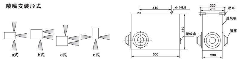 球形噴口立式誘導風機由離心式通風機、消聲機箱、三個萬向球形噴嘴組成,回轉角度<60* ,噴口φ80X3;