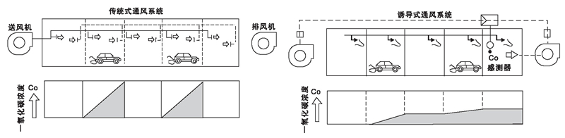 噴流誘導系統(tǒng)可設計智能系統(tǒng),在誘導空間內設置空氣質量傳感器,用以探測一氧化碳濃度,通過控制器自動控制誘導風機的開啟與停止(配置智能誘導風機),以實現(xiàn)自動化控制。